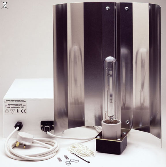 This is the popular high pressure sodium lamp, ballast and standard quality reflector combo. (Within hydroponics, high pressure sodium is very commonly refered to as HPS.) HPS provides good all-round performance and is used by beginners and experts alike. This combo is available with 250W, 400W, 600W and 1000W lamps, complete with matched ballasts and reflectors. Whenever possible, we provide lighing systems which are interoperable with Metal Halide [MH] lamps. Some people use MH lamps to simulate autumn (harvest time), although a reduced lighing period is usually sufficient for most plants. (WEEE)
